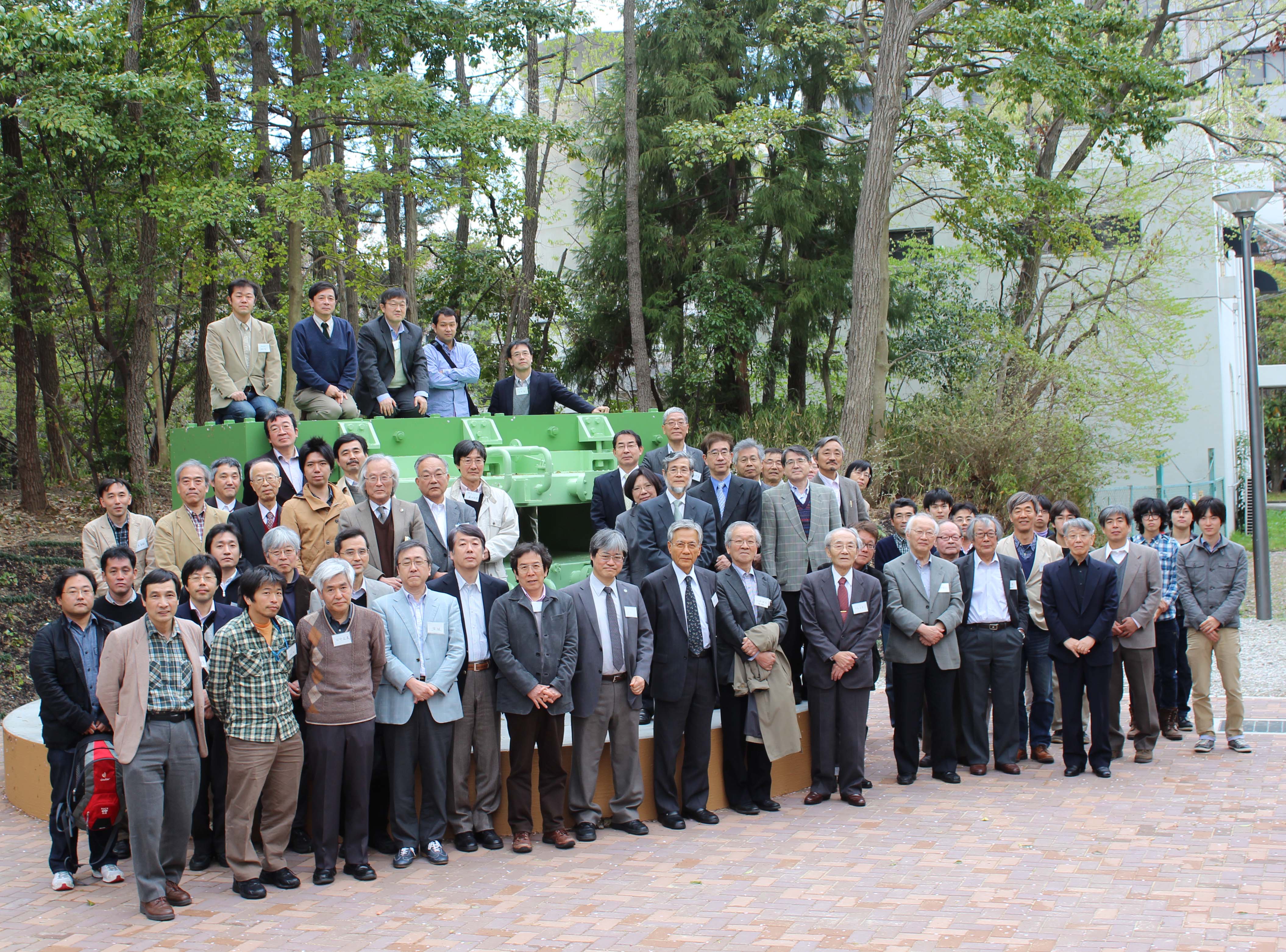 - 写真は、第2次大戦後占領軍によって大阪湾に放棄された旧サイクロトロンに代わって菊池•朝永先生らのご努力により再建されたわが国戦後初のサイクロトロンの記念碑として屋外に移設されたマグネットを取り囲んで撮影したものです。